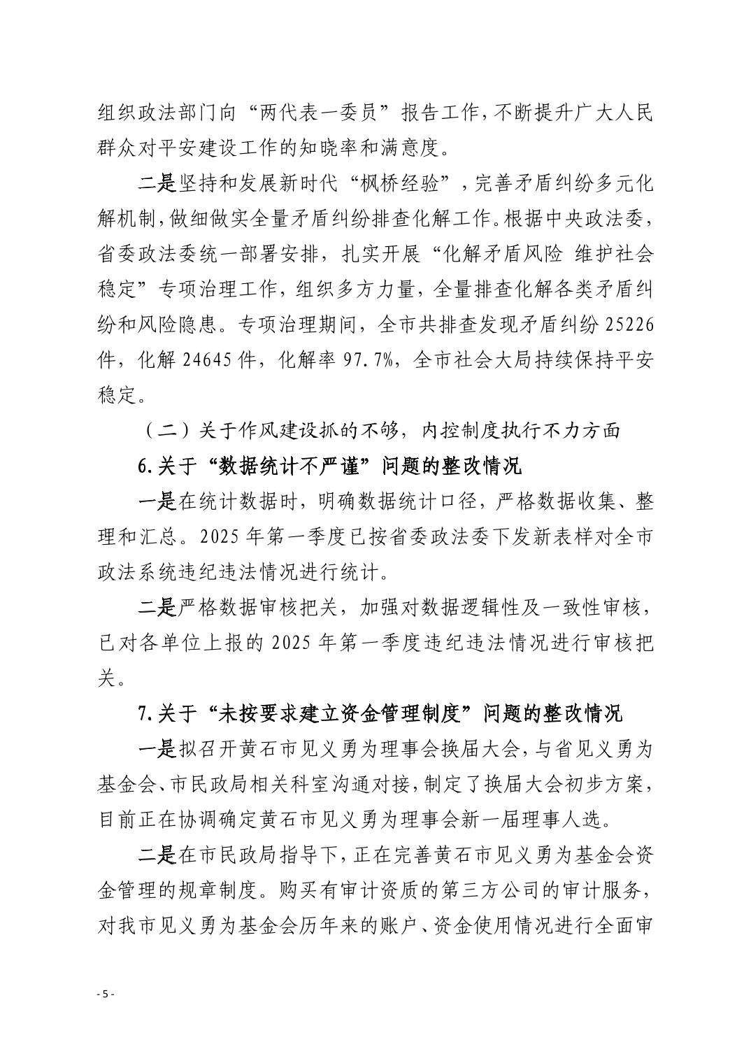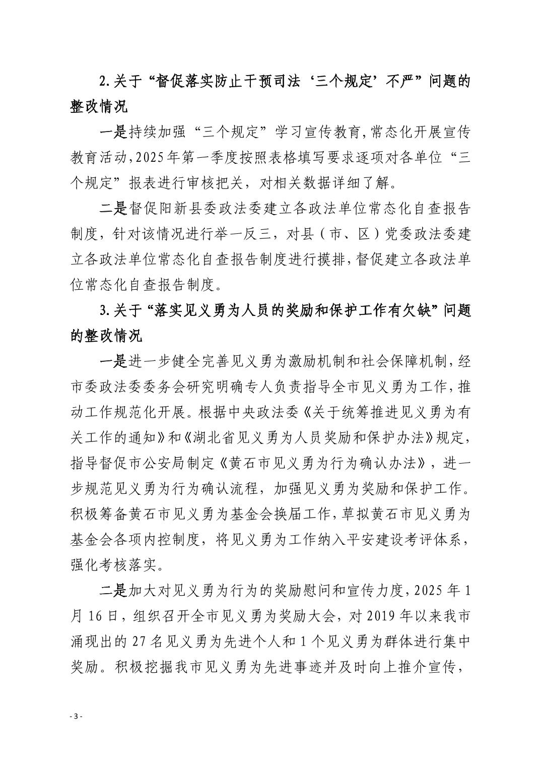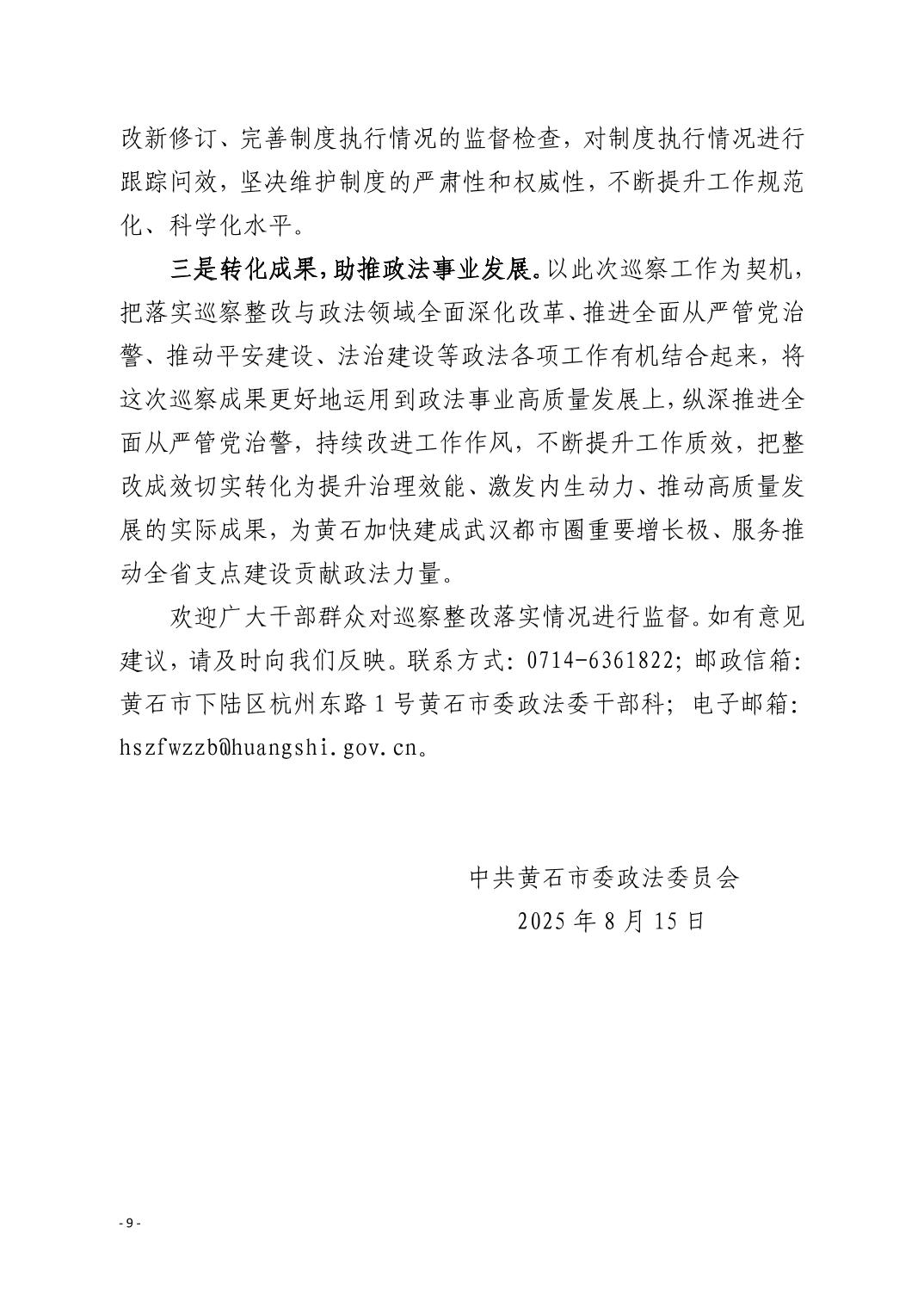 中共黄石市委政法委关于十四届市委第九轮巡察整改进展情况的通报