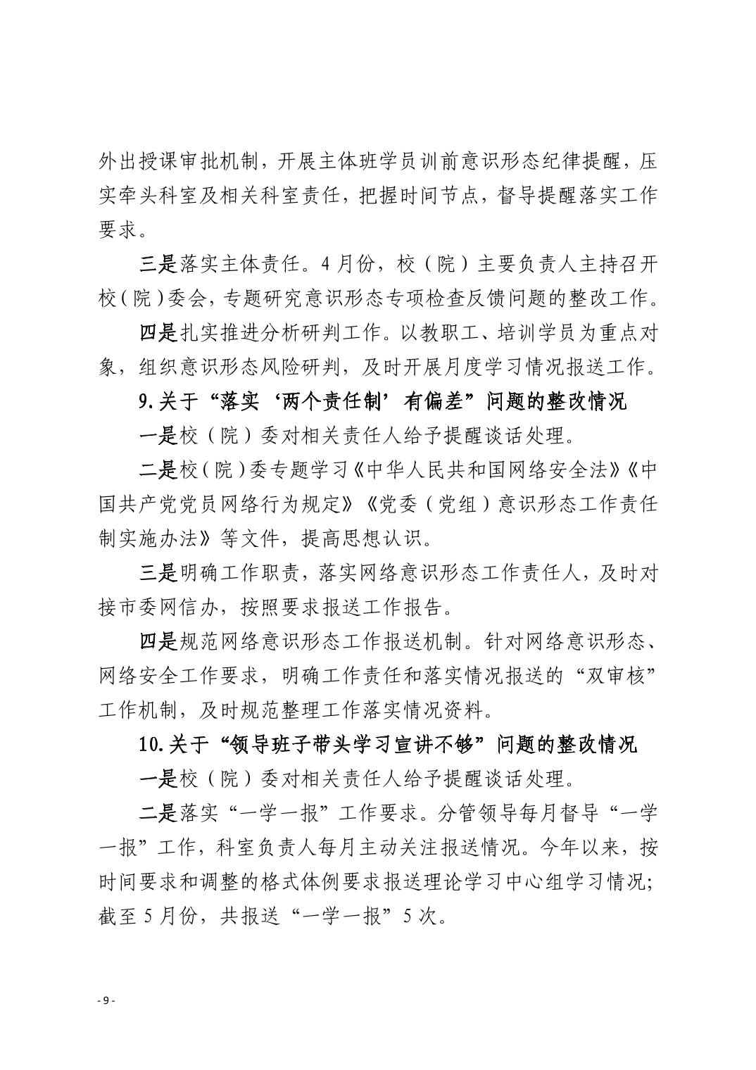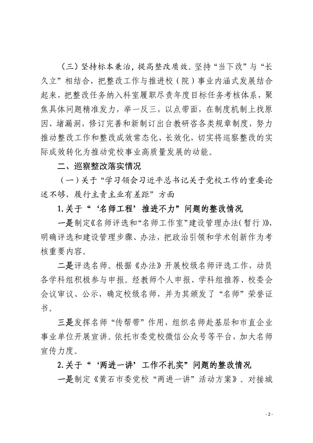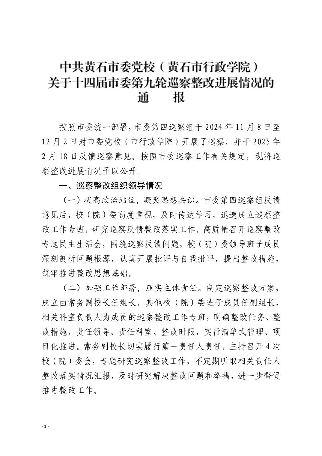 中共黄石市委党校(黄石市行政学院)关于十四届市委第九轮巡察整改进展情况的通报