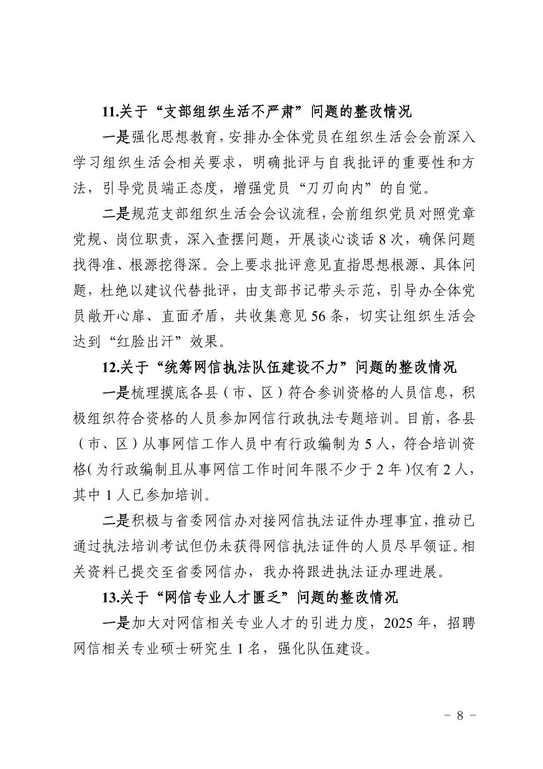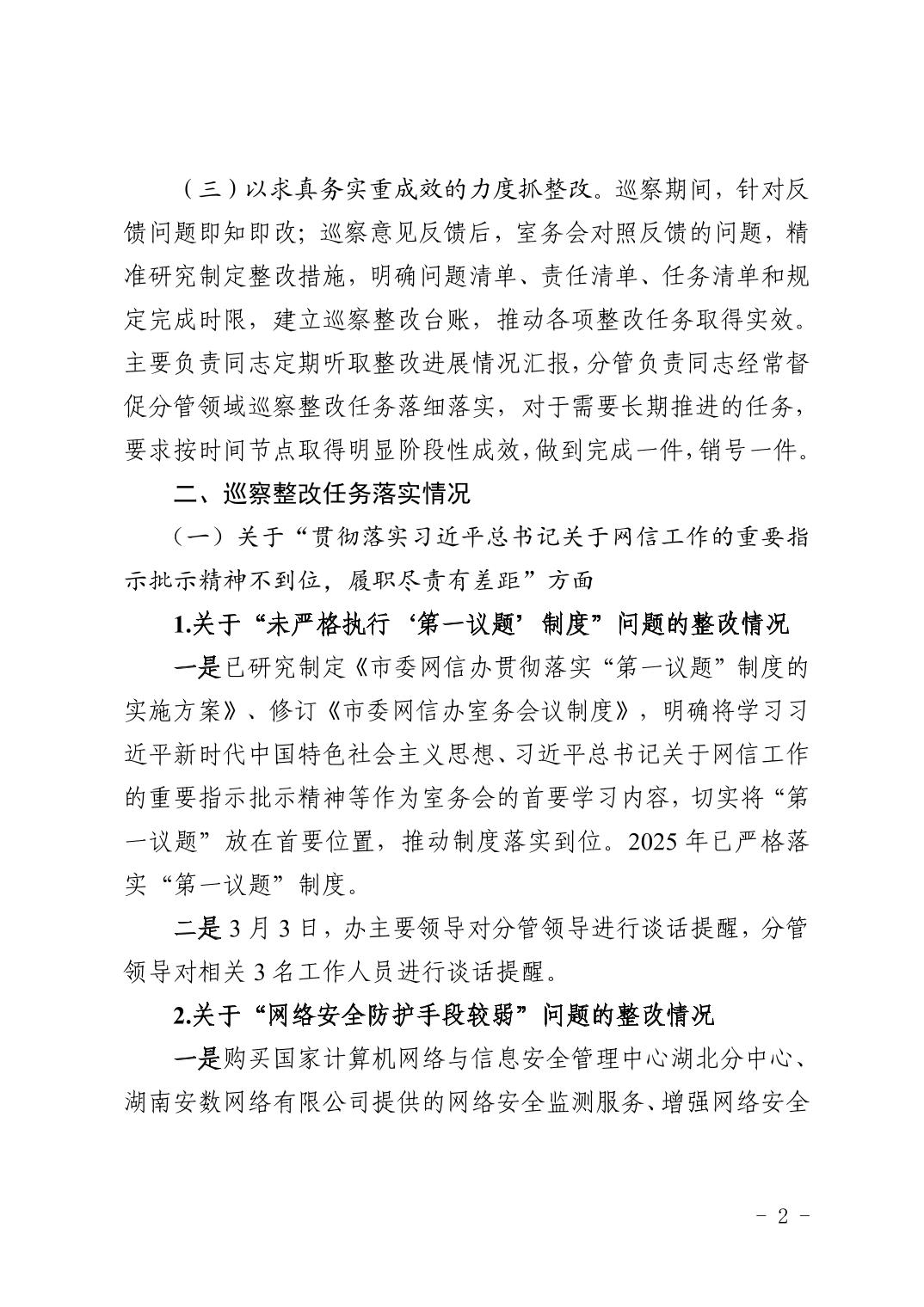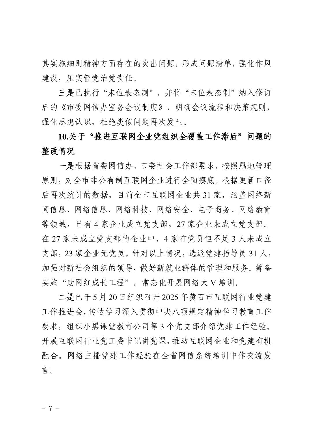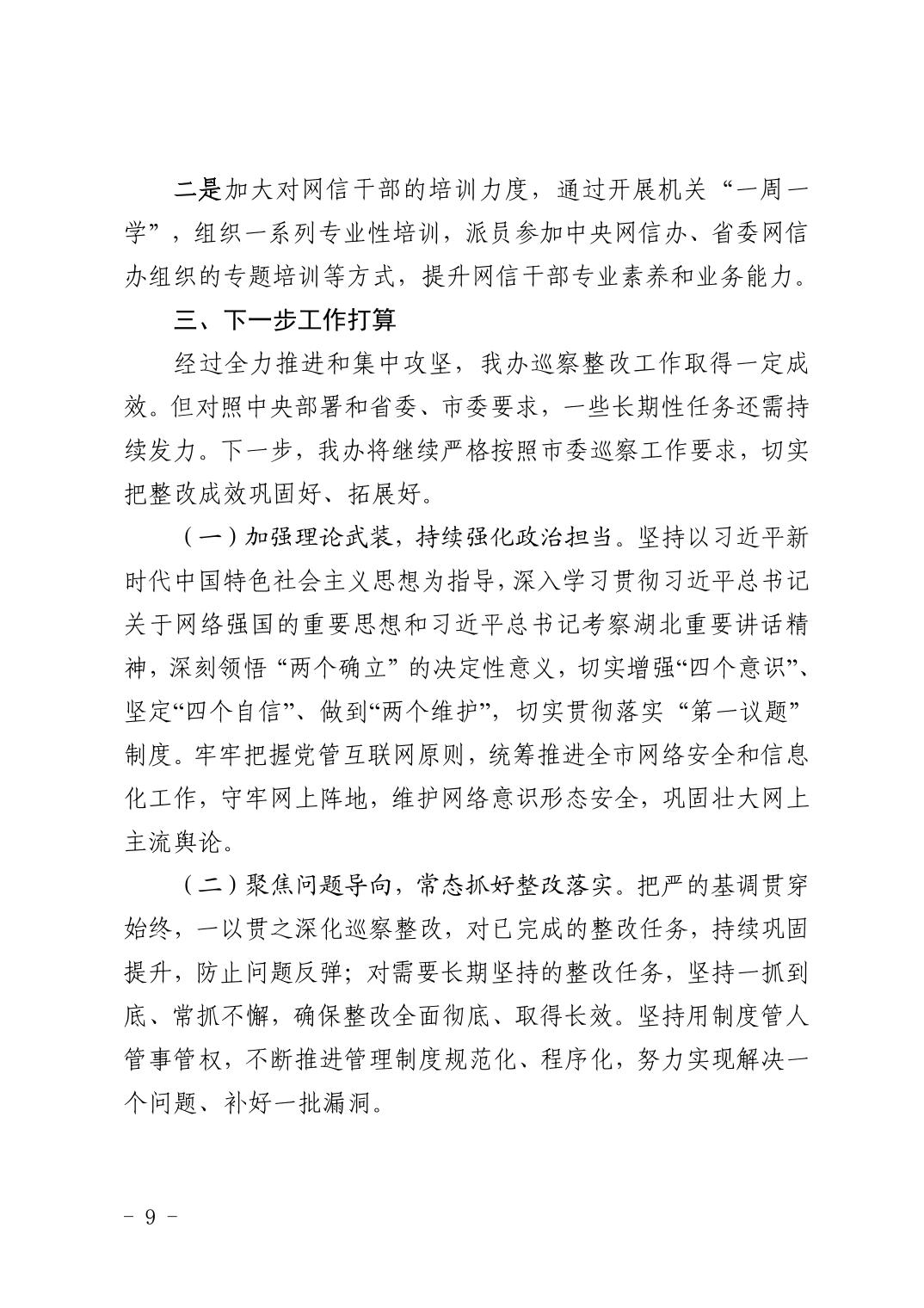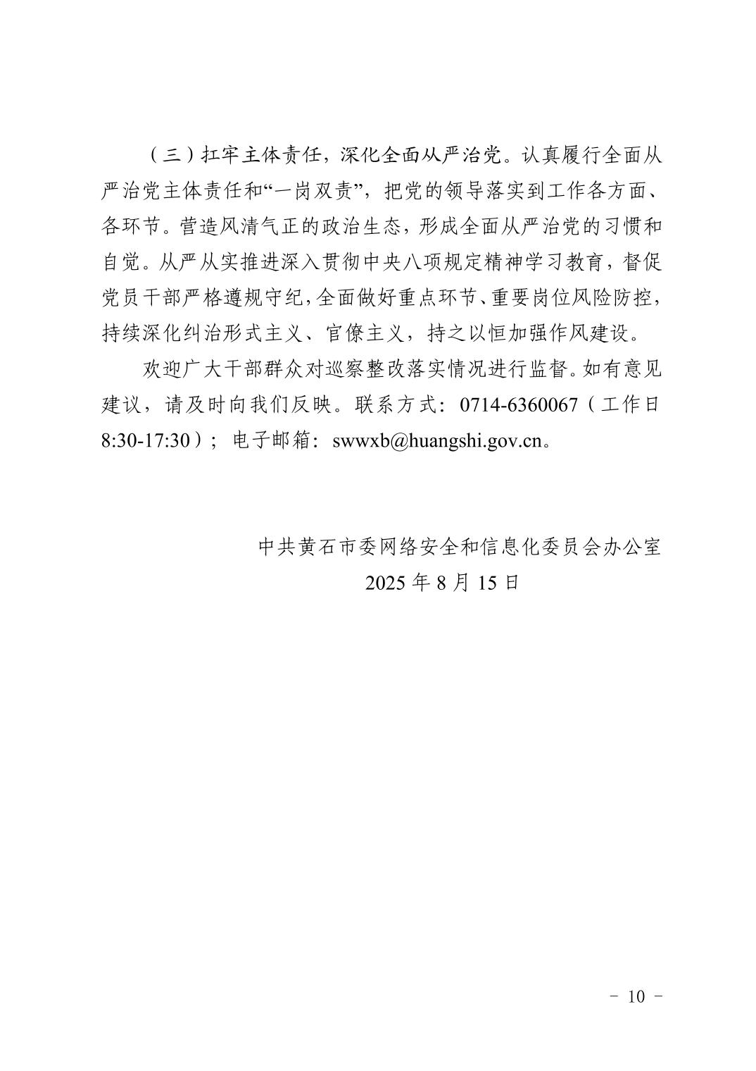 中共黄石市委网络安全和信息化委员会办公室关于十四届市委第九轮巡察整改进展情况的通报