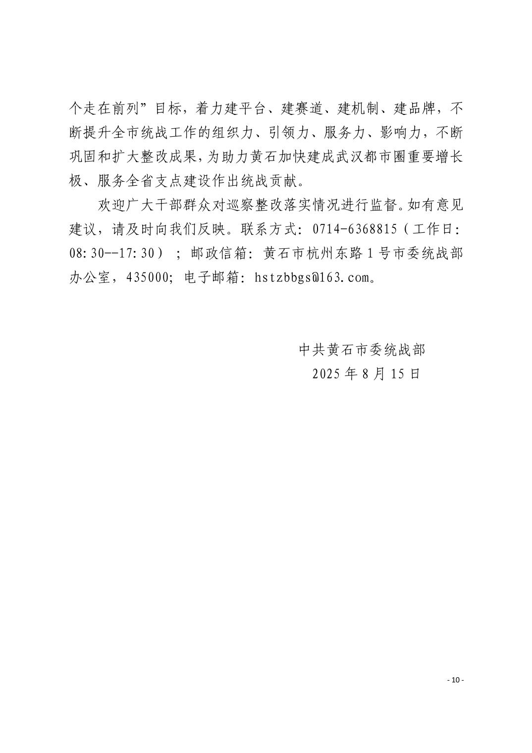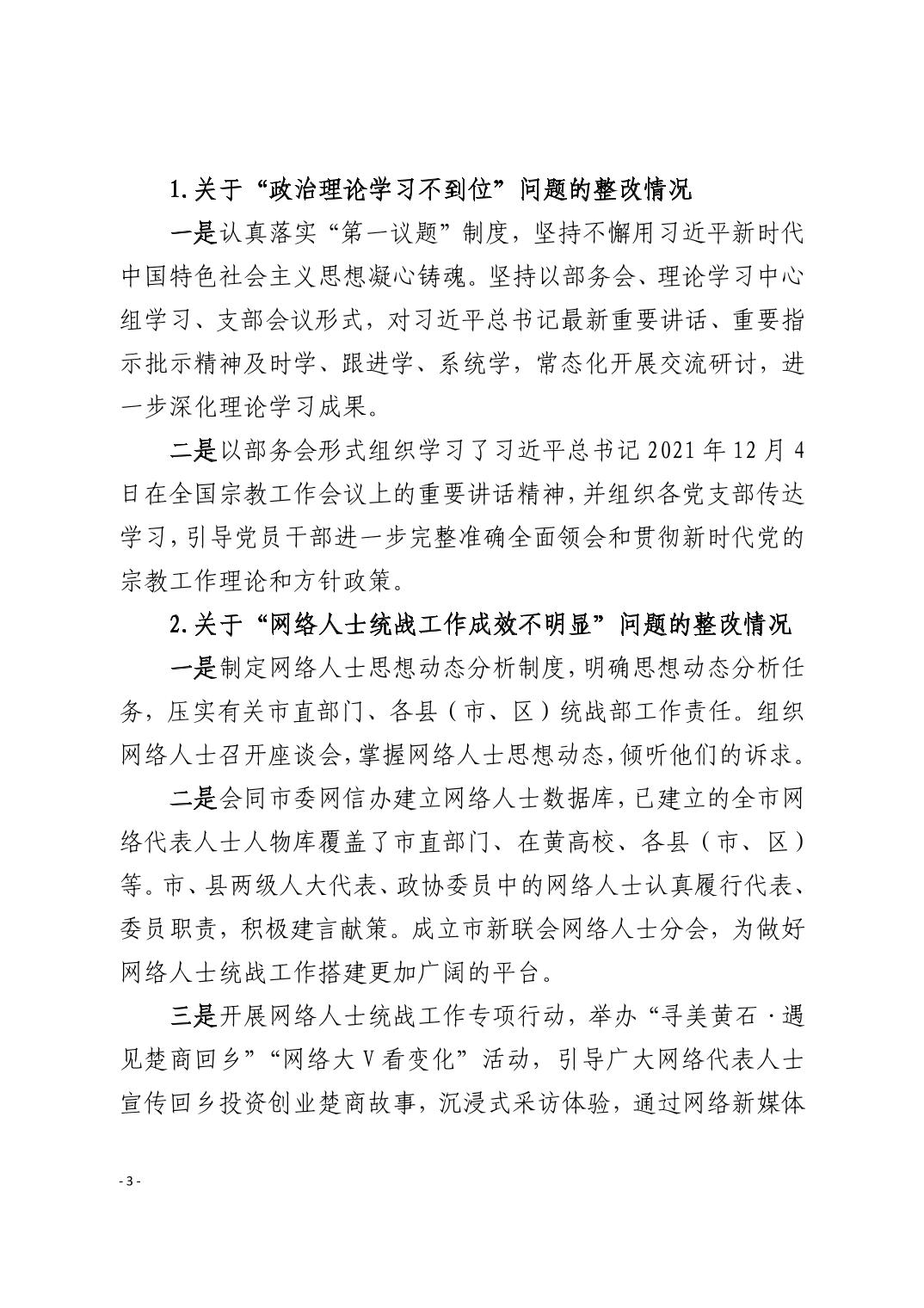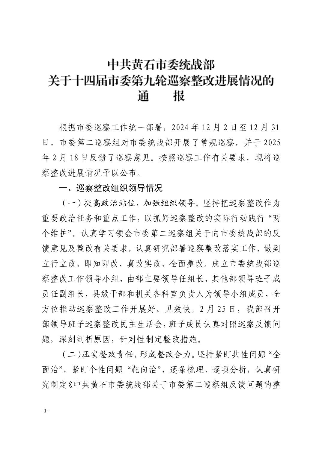 中共黄石市委统战部关于十四届市委第九轮巡察整改进展情况的通报