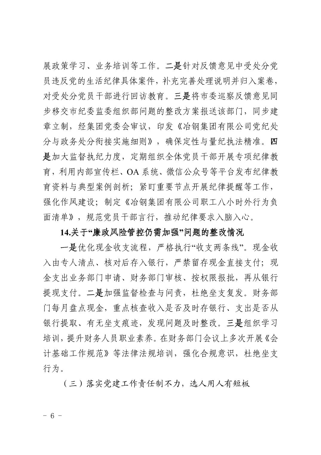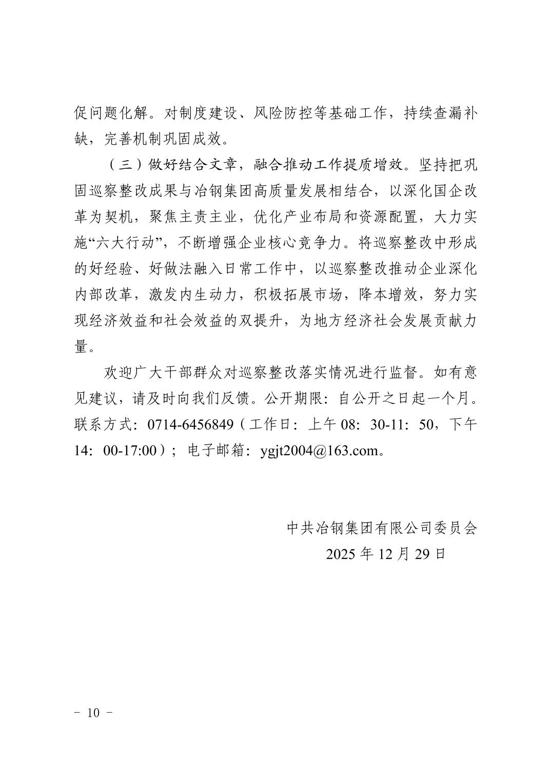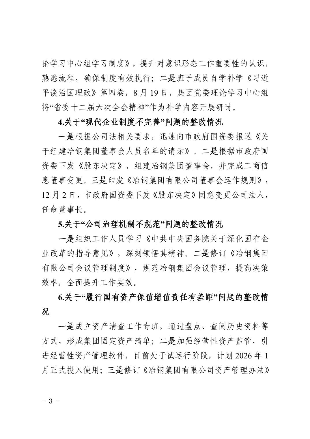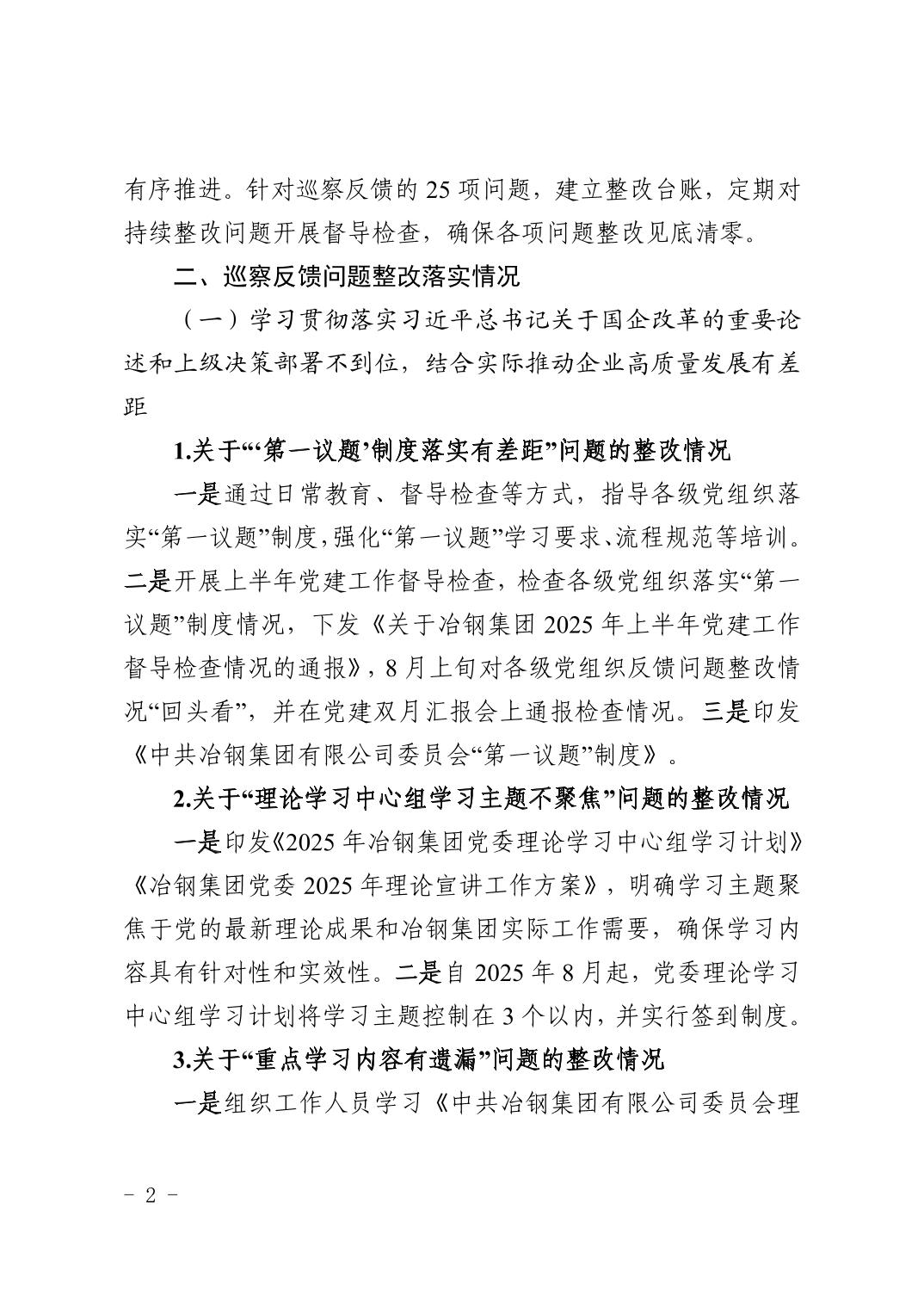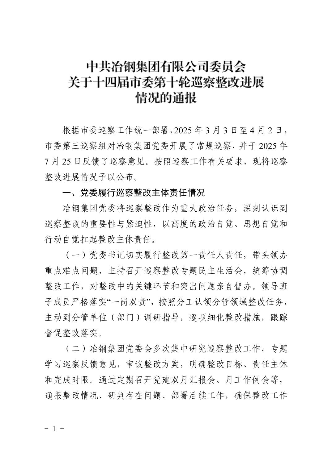 中共冶钢集团有限公司委员会关于十四届市委第十轮巡察整改进展情况的通报