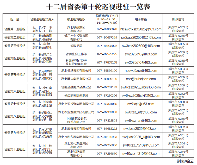 据悉,本轮巡视时间省属企业为60天左右、省直单位为40天左右,期间设立值班电话、邮政信箱、电子邮箱、“荆楚码上巡”,主要受理反映被巡视党组织领导班子及其成员、下一级党组织主要负责人和重要岗位领导干部问题的来信来电来访,重点是关于违反政治纪律、组织纪律、廉洁纪律、群众纪律、工作纪律、生活纪律等方面的举报和反映。巡视省属企业受理信访时间截止到2025年11月21日,巡视省属单位受理信访时间截止到2025年11月1日。