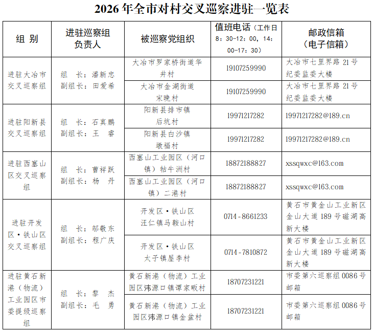 根据省委巡视工作领导小组统一部署,为助力提升群众身边不正之风和腐败问题集中整治质效,经市委同意,开展县(市、区)对村交叉巡察。2026年4月14日,全市5个对村交叉巡察组全部完成进驻。本轮巡察采取“提级+推磨式交叉”的方式对大冶市、阳新县、西塞山区、开发区·铁山区、黄石新港(物流)工业园区共10个重点村开展巡察,重点聚焦党中央决策部署和上级党组织工作要求在农村落实情况,农村群众身边不正之风和腐败问题,村党组织政治功能、组织功能发挥情况,对村巡察整改和成果运用情况等开展监督检查。