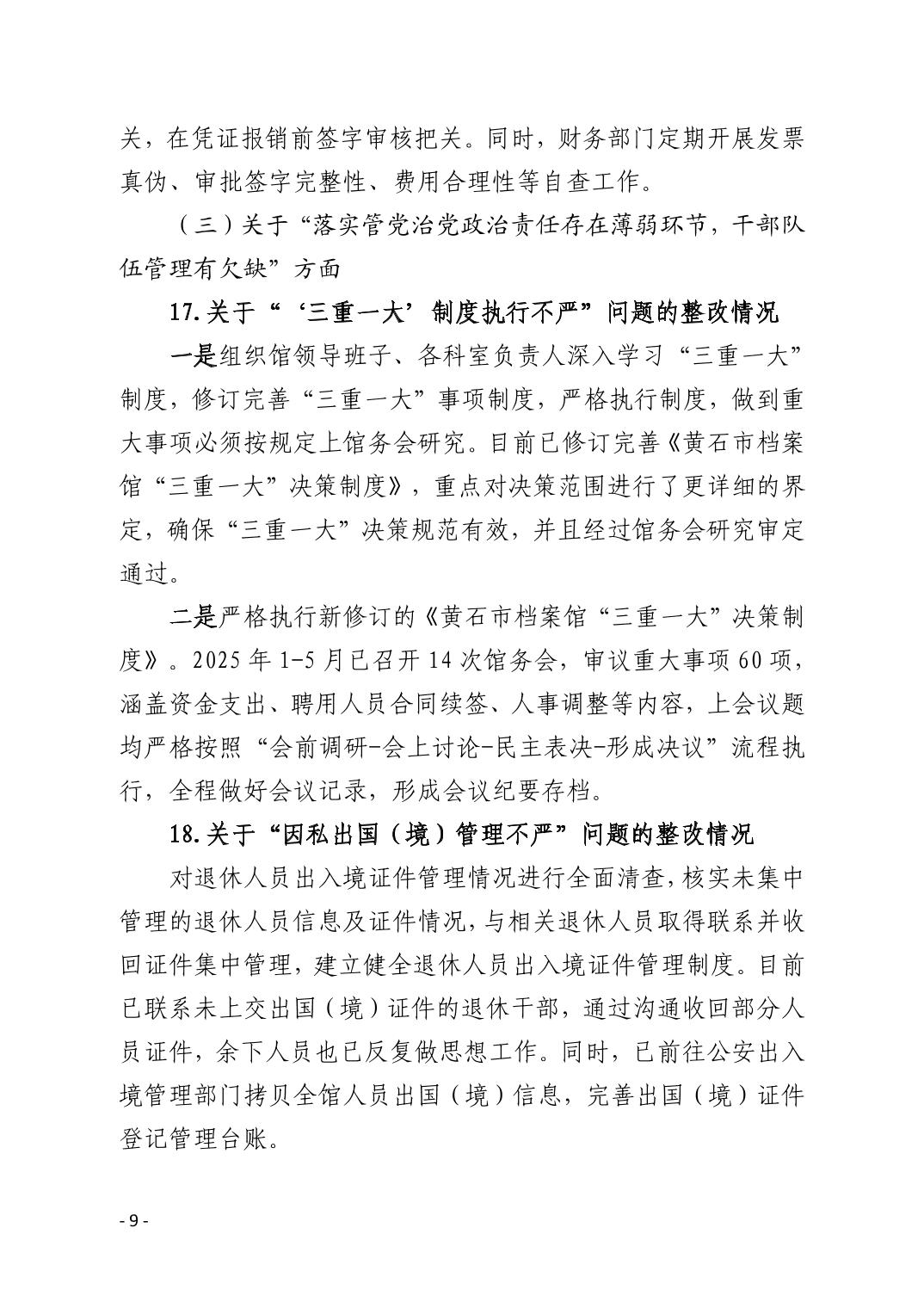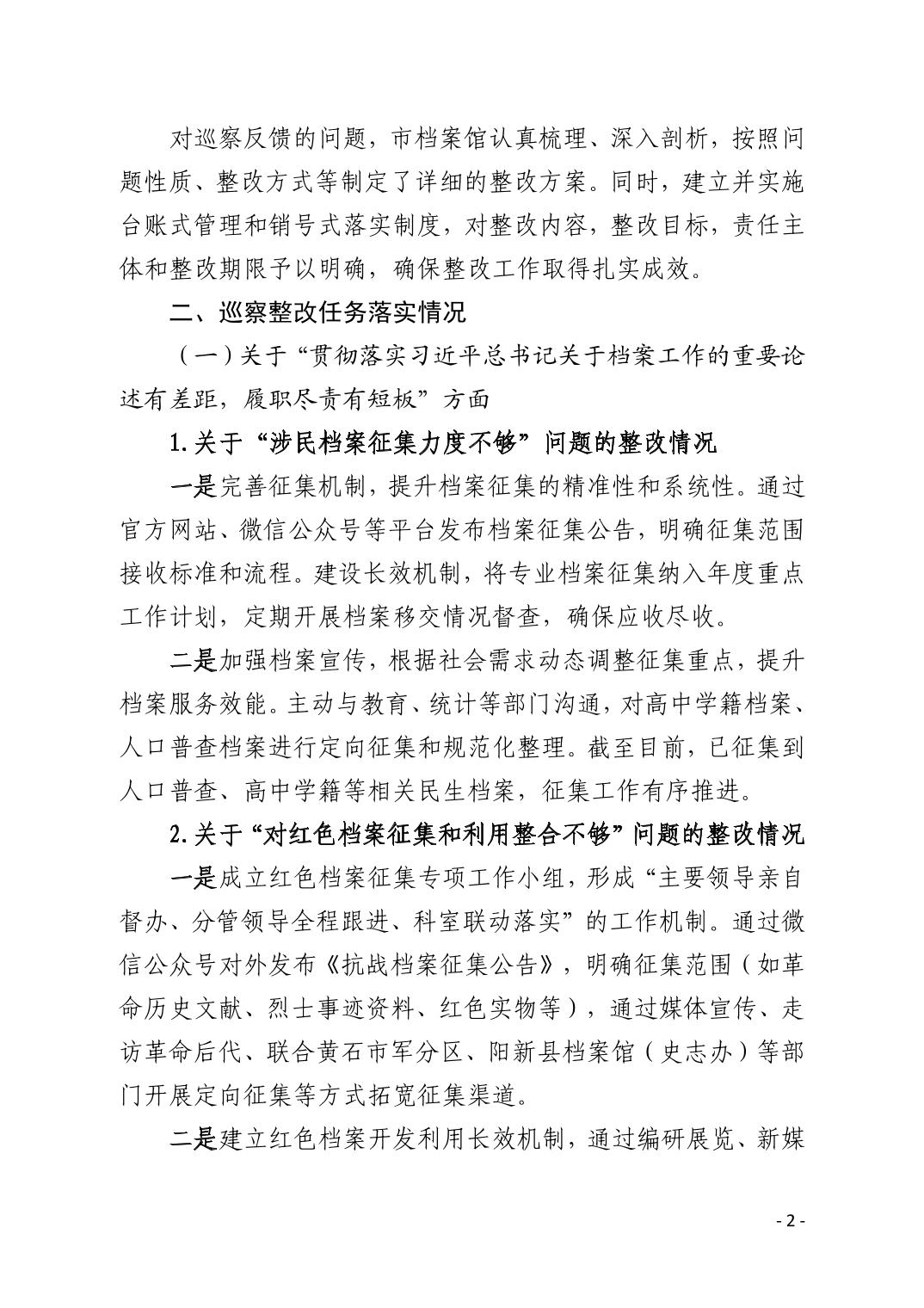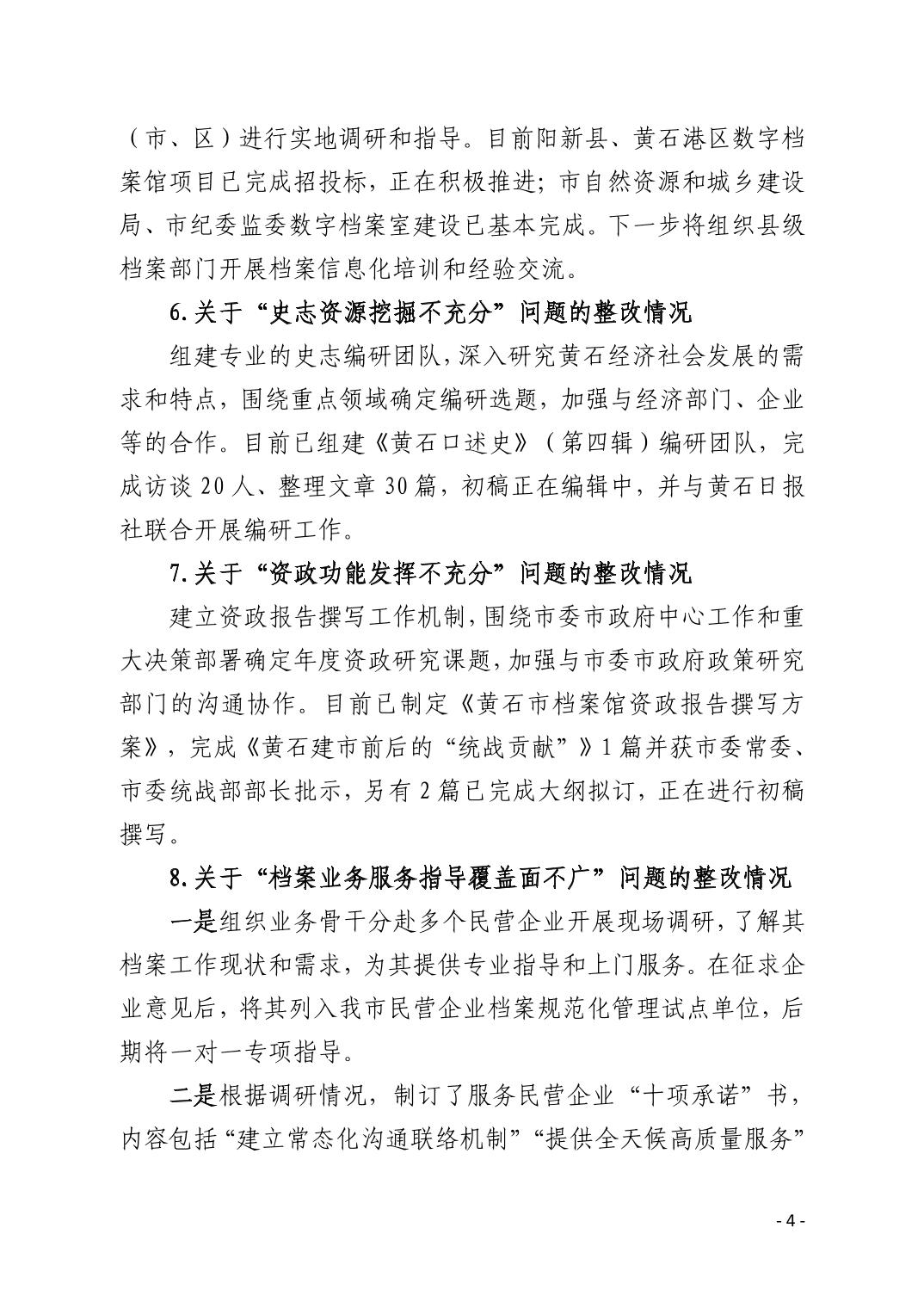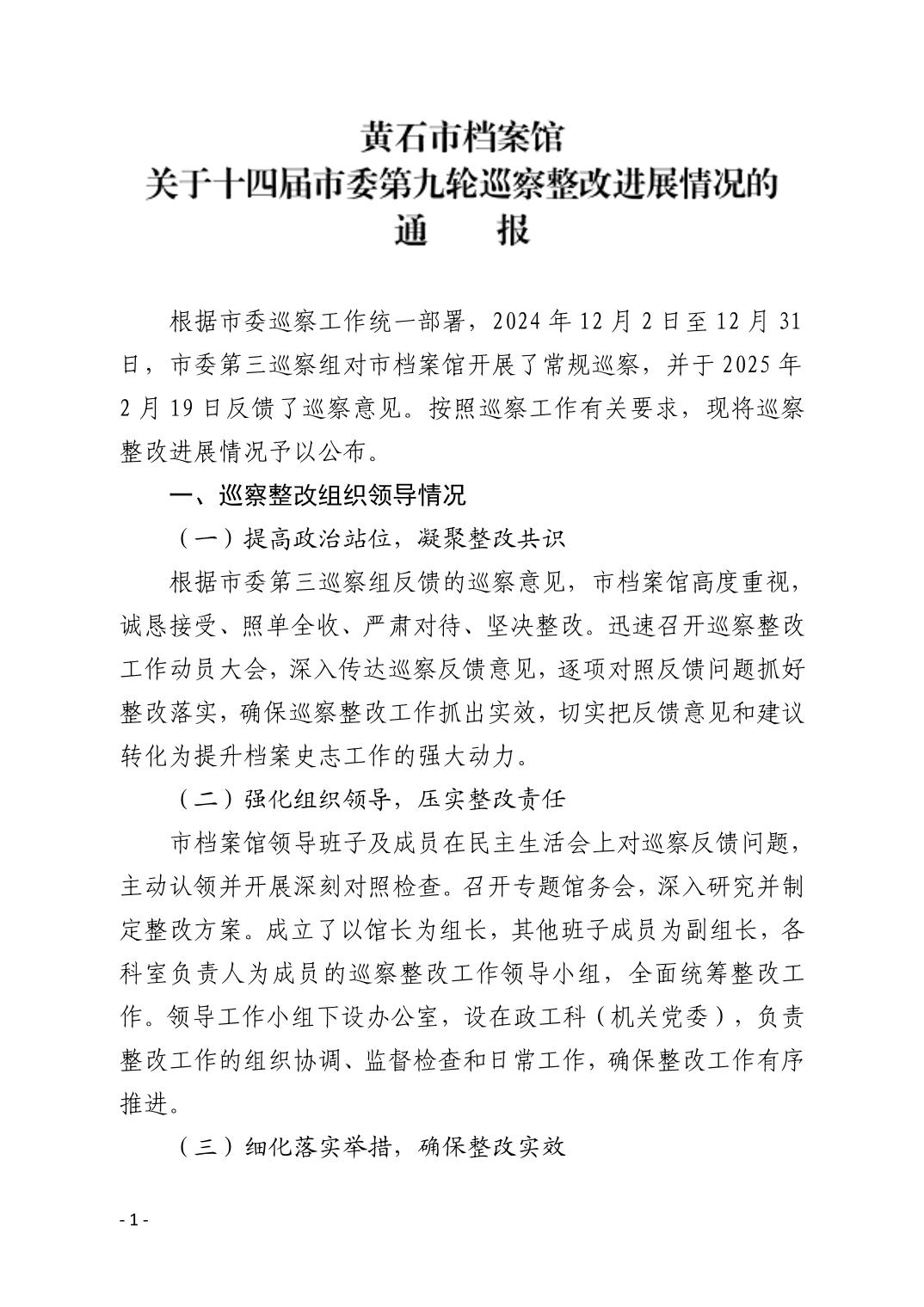 黄石市档案馆关于十四届市委第九轮巡察整改进展情况的通报