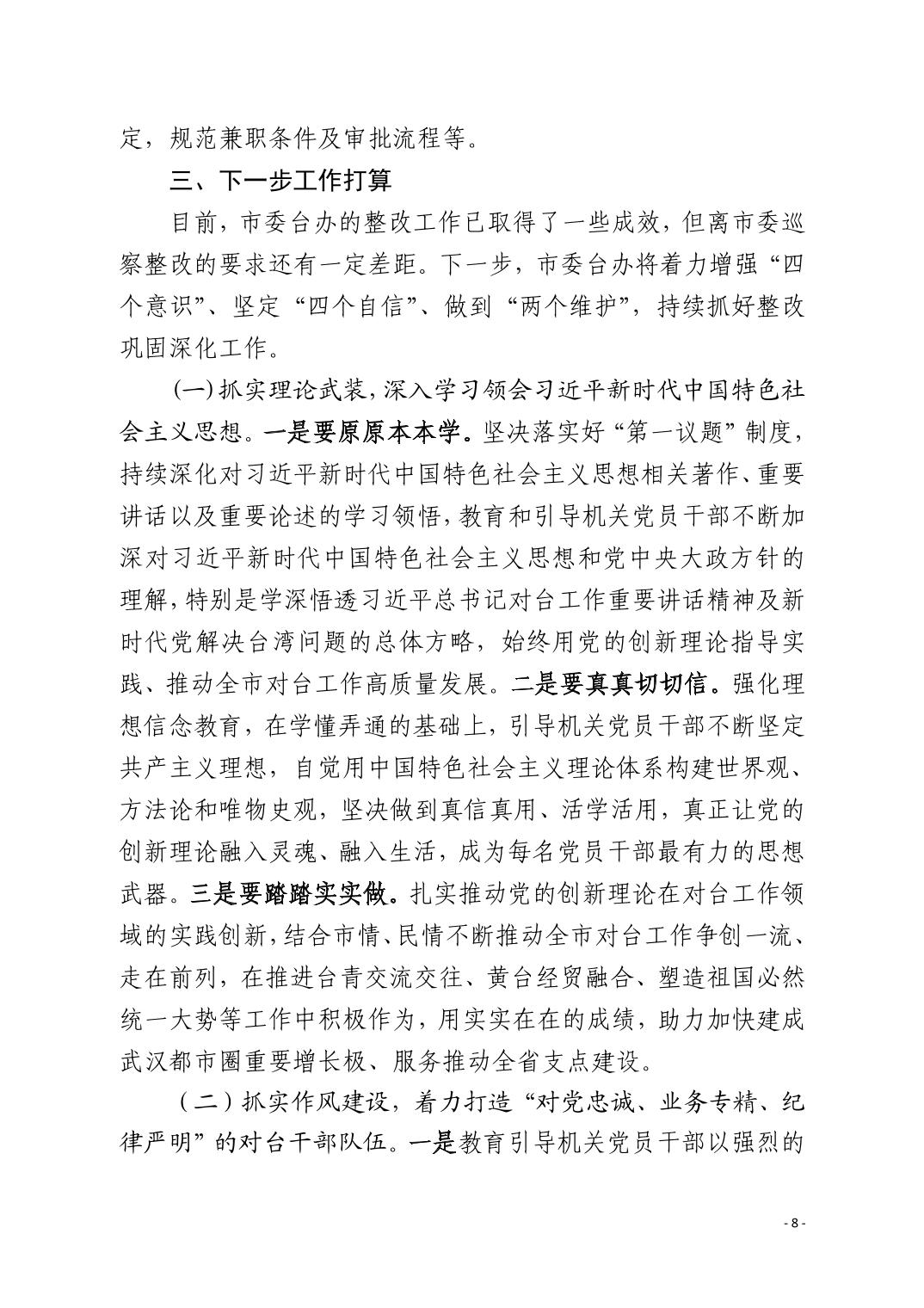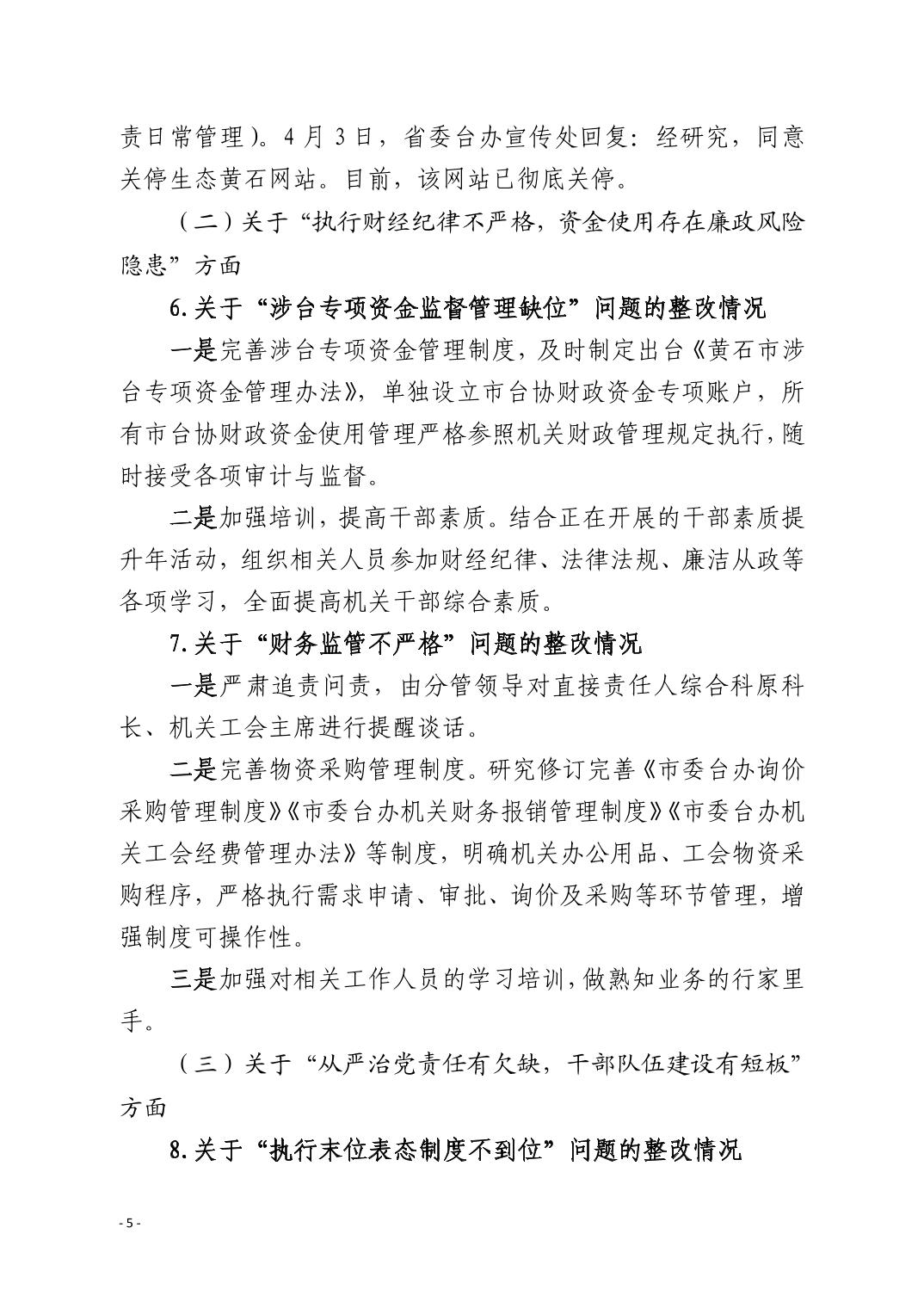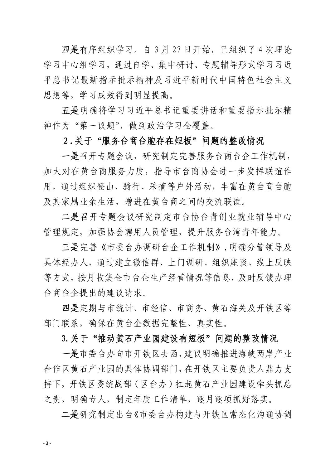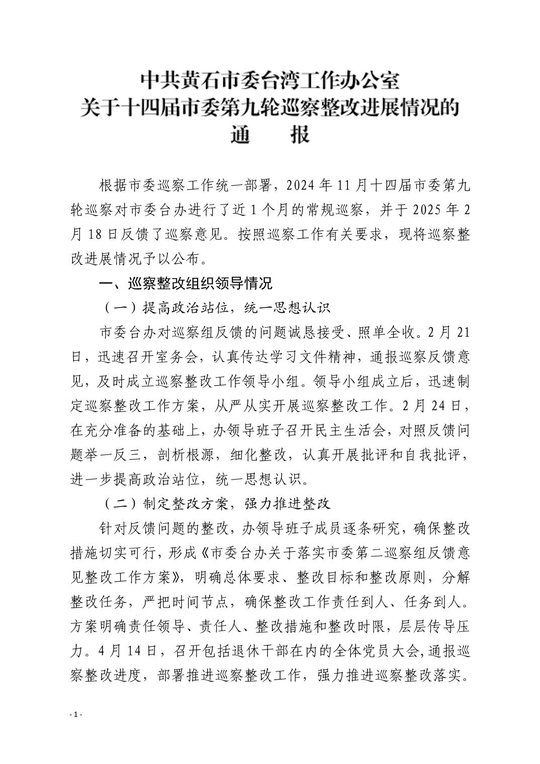中共黄石市委台湾工作办公室关于十四届市委第九轮巡察整改进展情况的通报