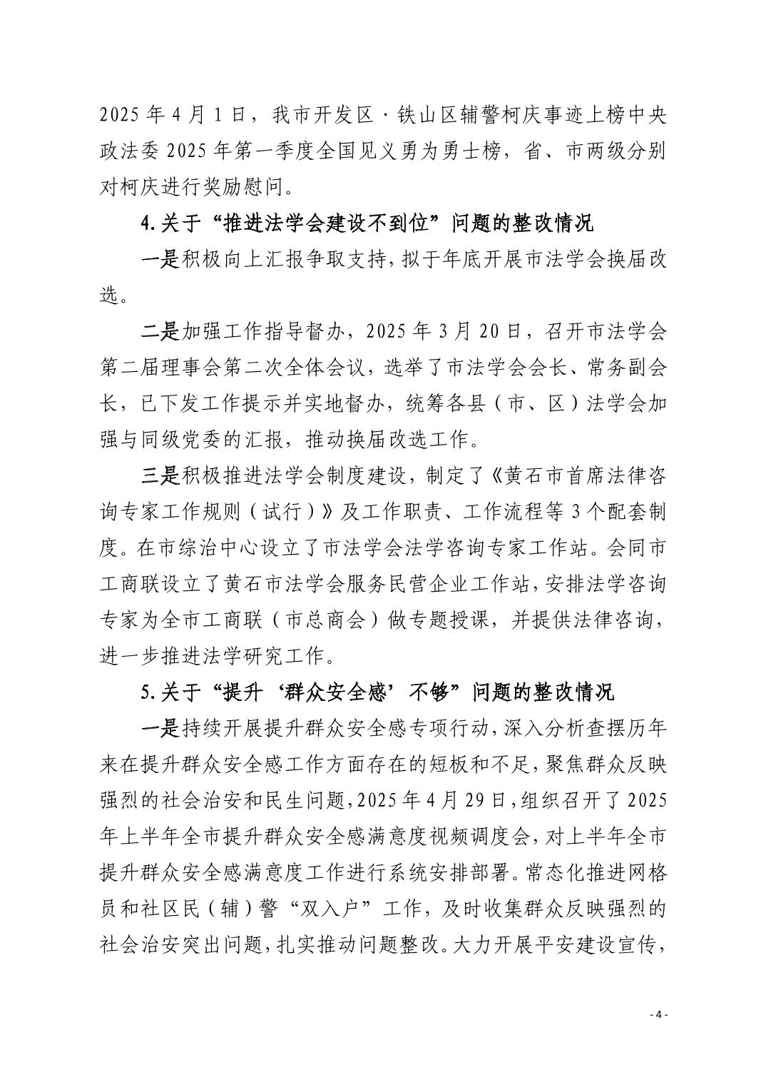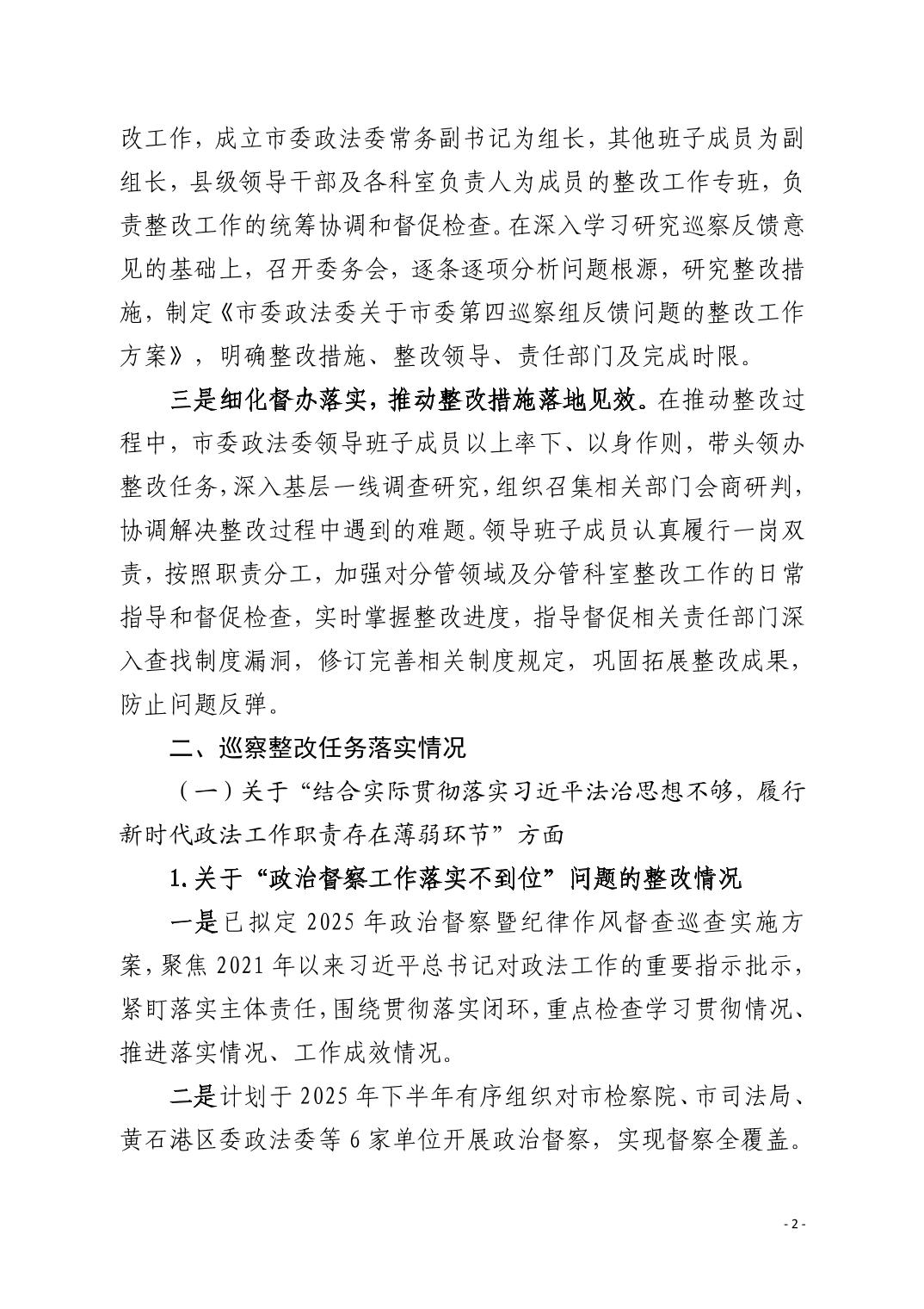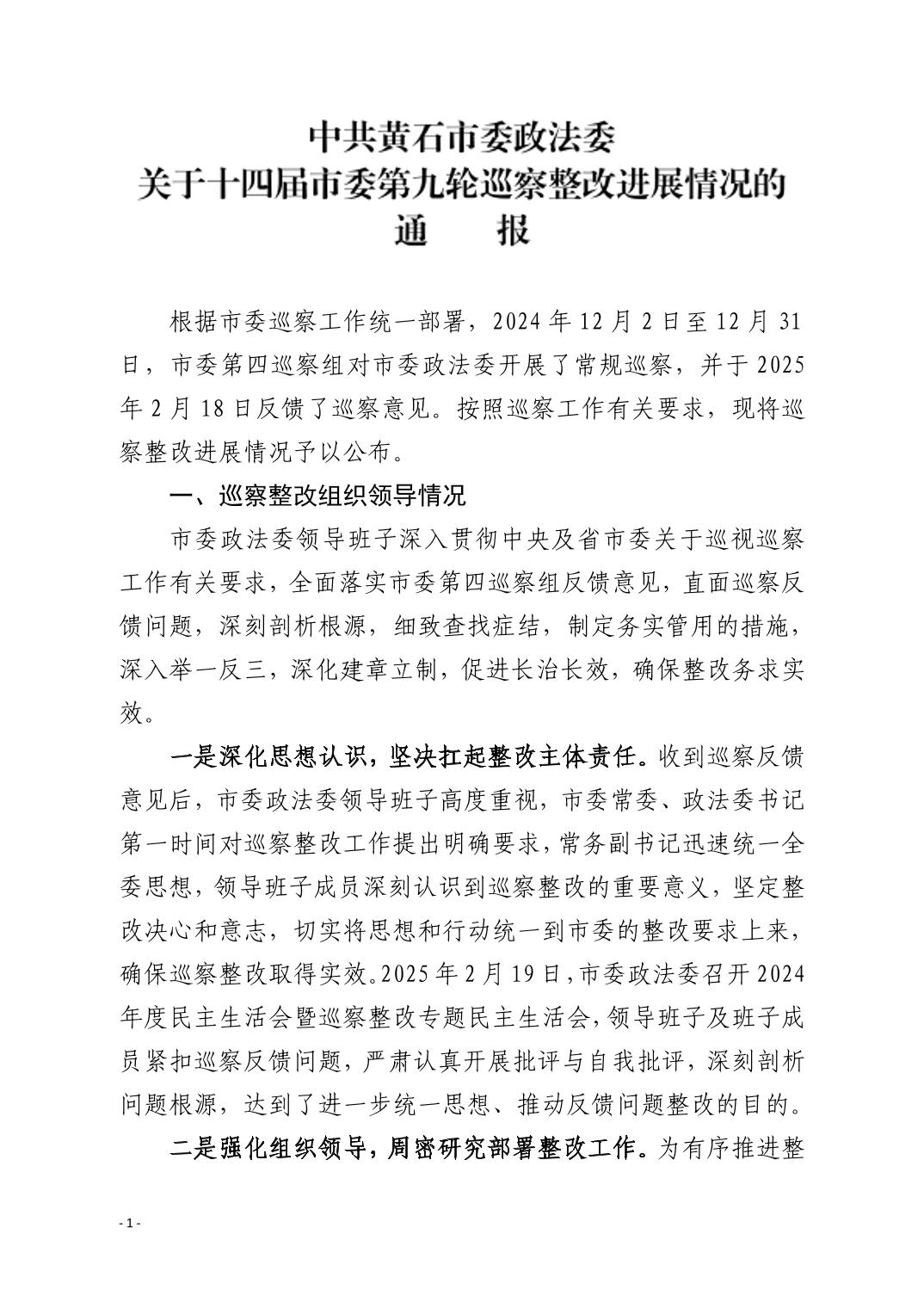 中共黄石市委政法委关于十四届市委第九轮巡察整改进展情况的通报
