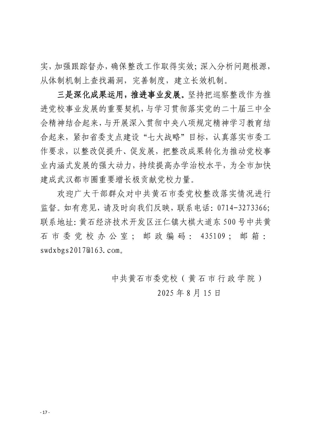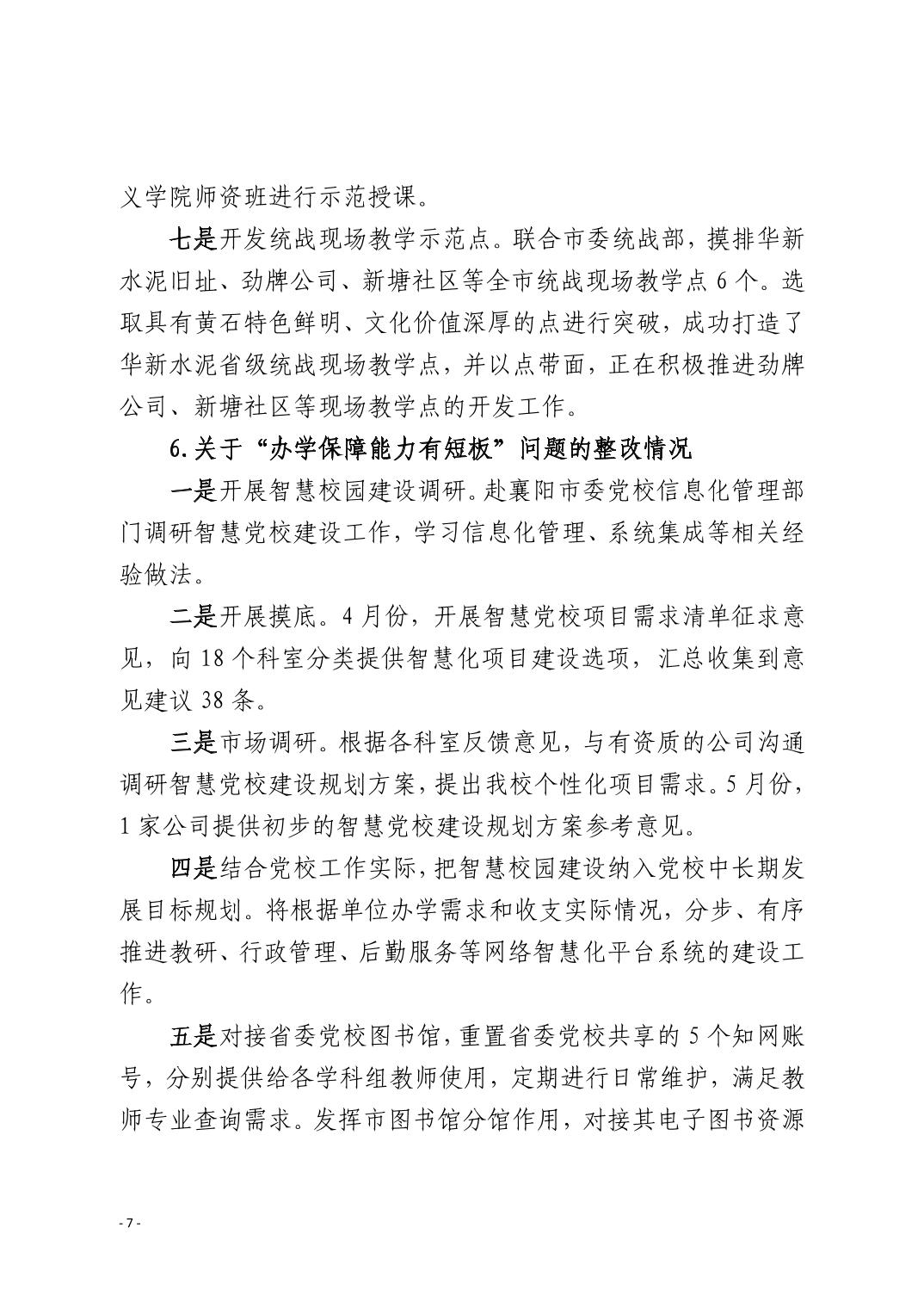 中共黄石市委党校(黄石市行政学院)关于十四届市委第九轮巡察整改进展情况的通报