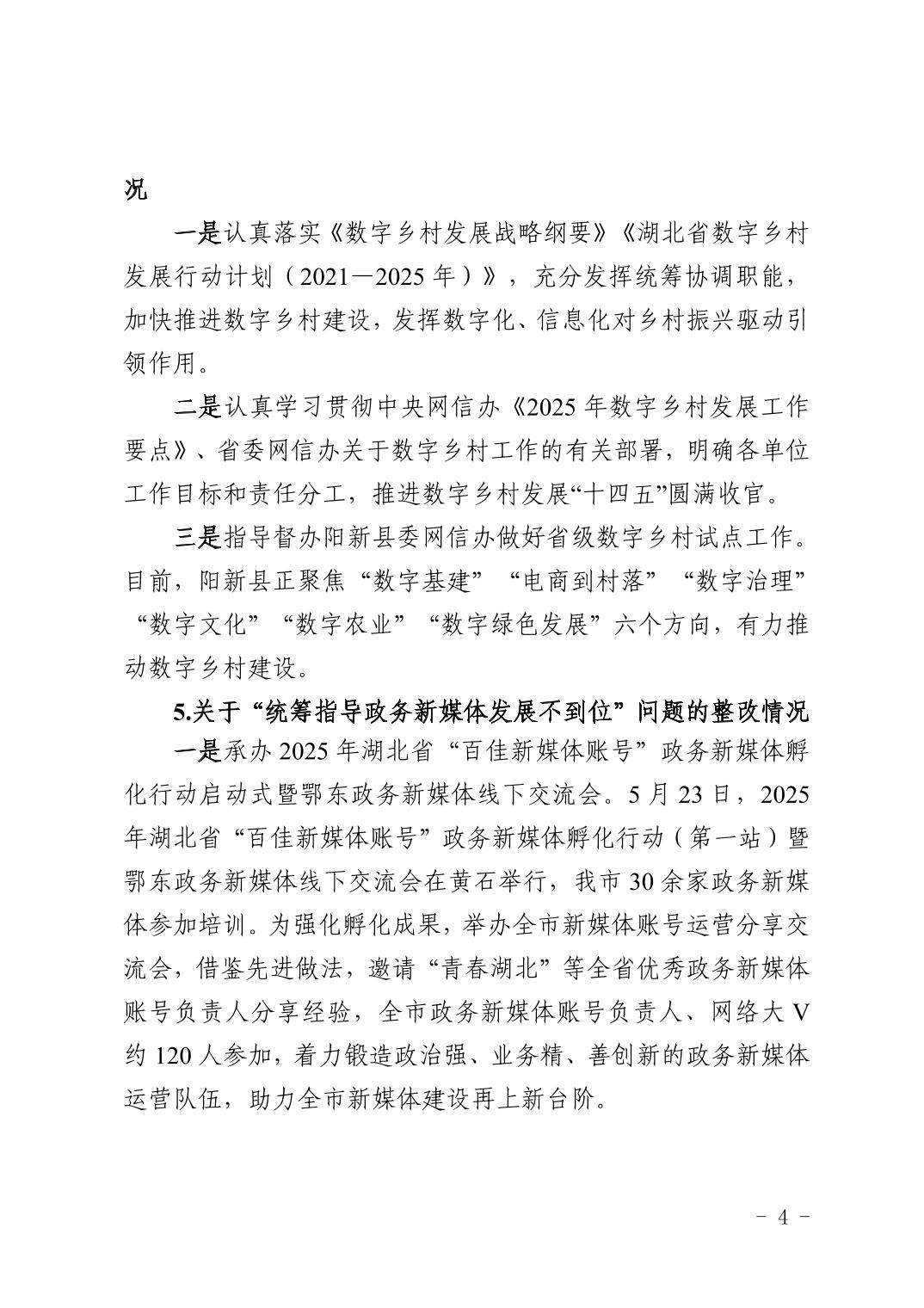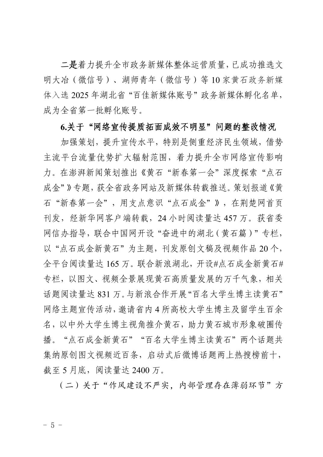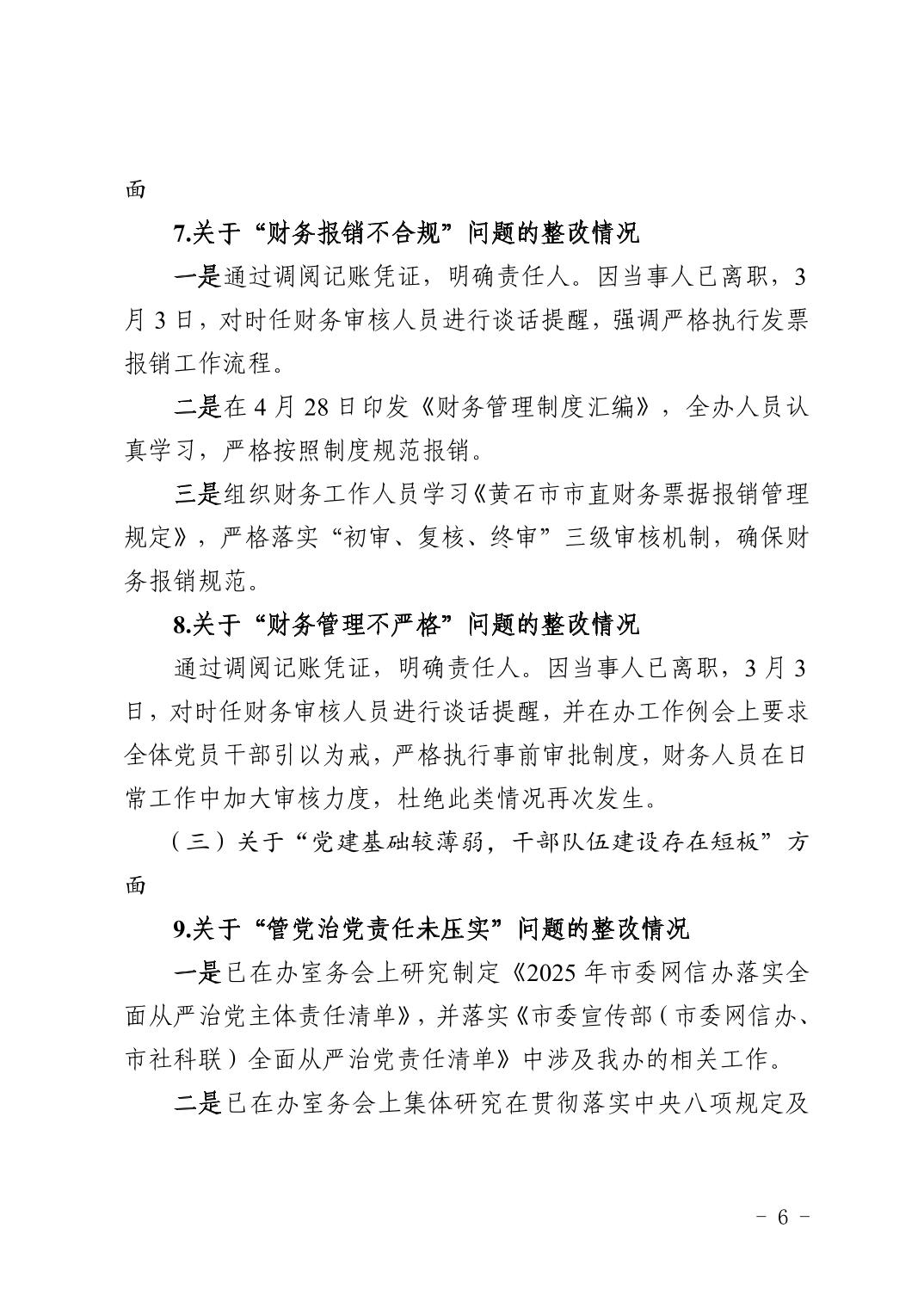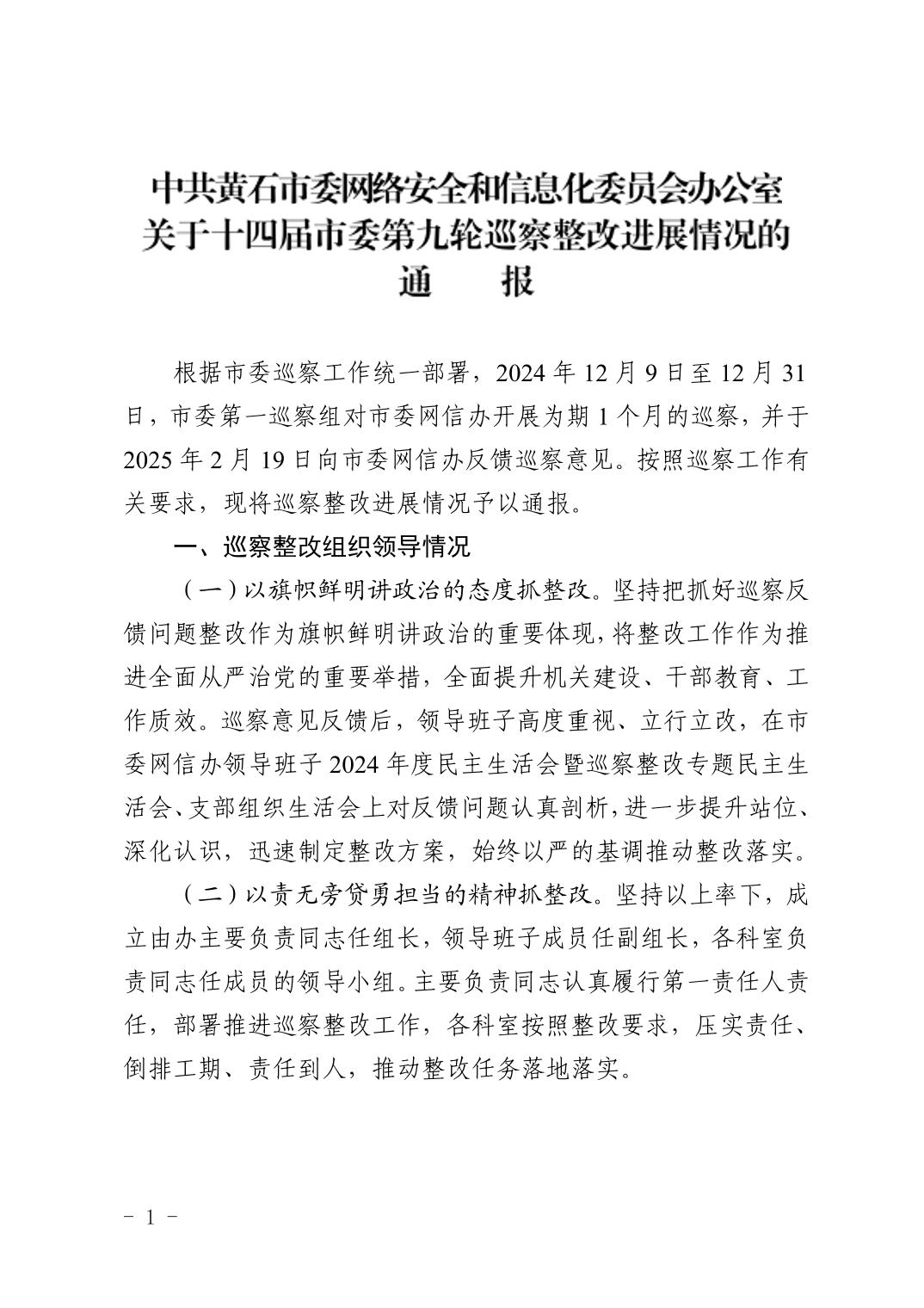 中共黄石市委网络安全和信息化委员会办公室关于十四届市委第九轮巡察整改进展情况的通报