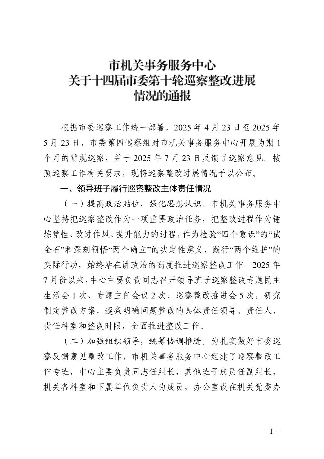 市机关事务服务中心关于十四届市委第十轮巡察整改进展情况的通报